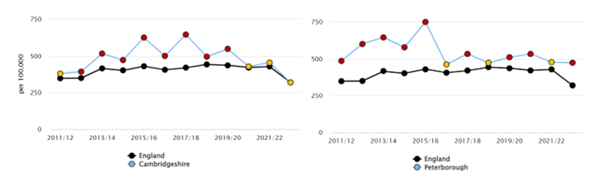 - All-Age Self-Harm Admission Trends: All-age self-harm admission rates in Cambridgeshire and Peterborough have decreased substantially in recent years (Figures 12-13). From both areas being significantly above national rates in 2019/20, Cambridgeshire rates fell below national levels in 2022/23, while Peterborough rates are now similar to national. Admissions per 100,000 in Peterborough more than halved from 303 in 2015/16 to 130 in 2022/23; Cambridgeshire rates also more than halved over the same period, from 261 to 106. This decline somewhat mirrors the national downward trend over the last few years, but the decline locally has been more pronounced.