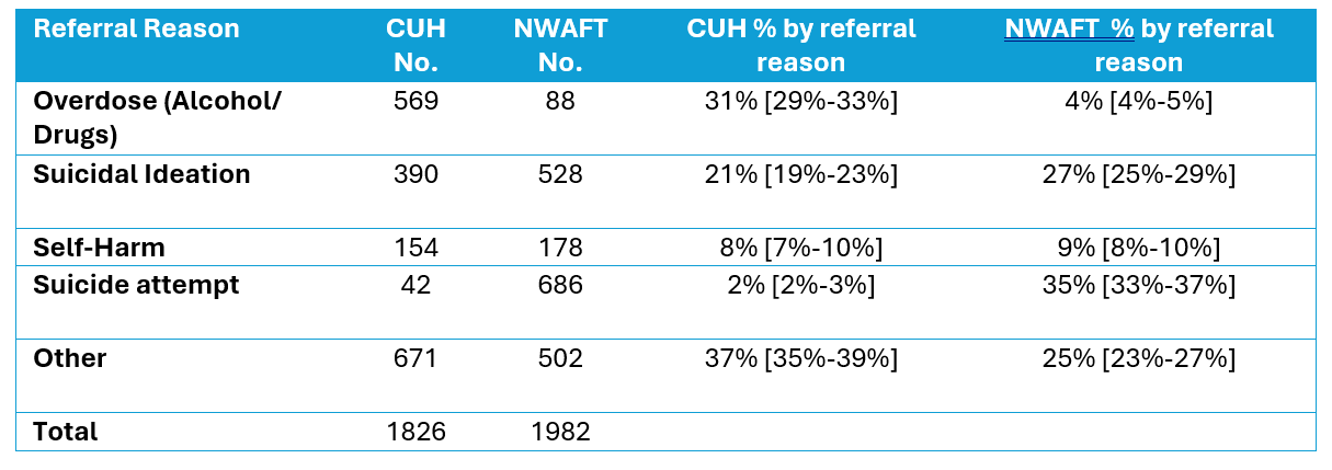 - Self-injurious behaviour split. In 2023, 63% of A&E patients seen by liaison psychiatry at CUH and 75% at NWAFT were linked to self-harm, suicide attempts, suicidal ideation, or overdose (Table 7). Despite differences in proportions, both trusts revealed that A&E attendances primarily relate to suicide attempts, ideation, and overdoses rather than self-harm, consistent with national findings that hospital data underrepresents self-harm (28).