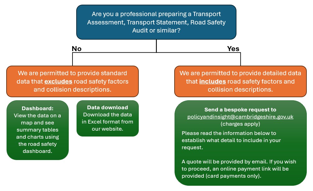 Road safety professionals preparing Transport Assessments, Transport Statements and Road Safety Audits are advised to make a bespoke request for detailed collision data that includes collision descriptions and road safety factors.